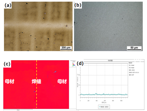 针对于镍基单晶DD5涡轮叶片材料的裂纹修复,在自主研发的集成计算平台上进行高通量批量计算及仿真模拟,设计开发了一款低B、Si的高强度镍基钎料(WZ-B1)。图1显示DD5单晶经过TLP焊接后,焊缝区已实现完全等温凝固,焊缝与母材组织基本均质化,无脆性相,EBSD反极图显示焊缝与母材形成完整单晶,取向差极小(约1.5°),高温持久寿命达到母材80%以上。