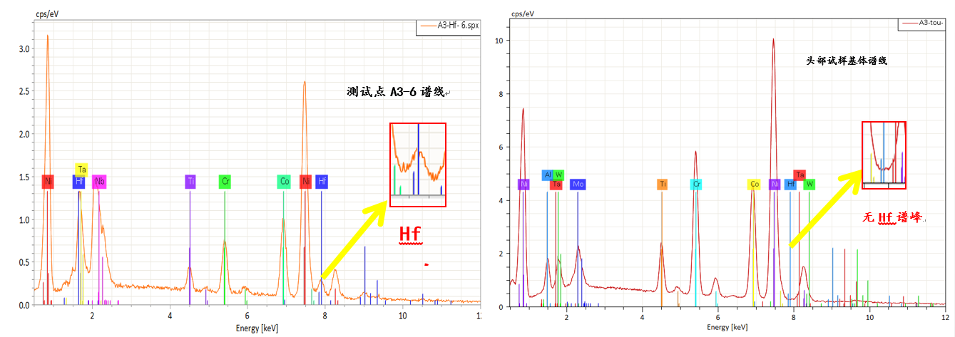3. 对比基体谱线,测试点A3-6中Hf元素有明显谱峰但在基体谱线中,未发现Hf元素谱峰.