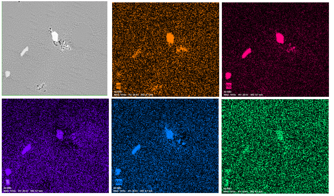 5. 在选定区做Mapping,发现共晶区高亮区域都有Hf元素聚集,此外还有Ti、Nb、Mo元素。
